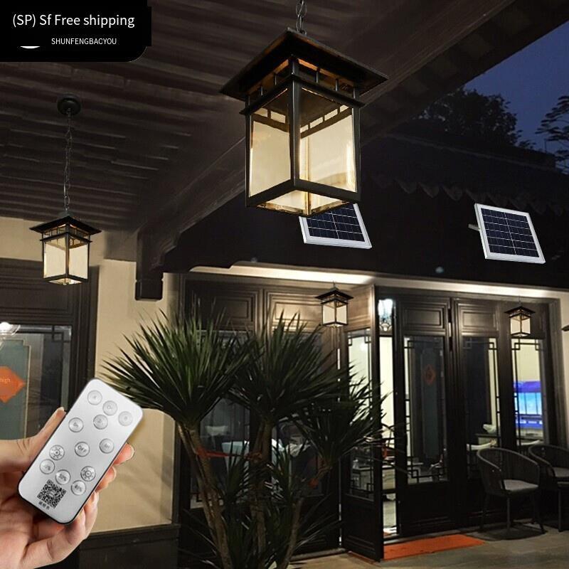 Solar Chandelier New Chinese Outdoor Waterproof Corridor Balcony Courtyard Lamp Outdoor Villa Aisle Induction Pavilion Lamp Solar Black Large Pavilion